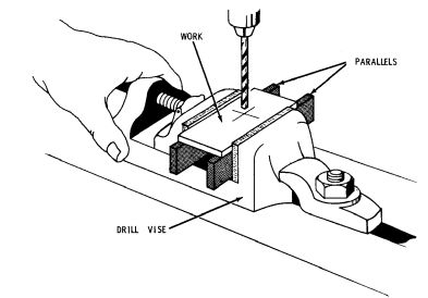 Benda kerja yang akan dibor harus secara aman dikencangkan supaya diperoleh hasil yang memuaskan serta pekerjaan yang dilakukan aman. Ragum (drill press vise) digunakan untuk memegang benda kerja pada drill press table. Gambar 30 memperlihatkan ragum yang dasarnya bisa diputar dan Gambar 31 memperlihatkan air-hydraulic vise yang digunakan untuk mesin dengan produksi tinggi. Kombinasi dari meja dan ragum (vise) pada drilling machine diperlihatkan pada Gambar 32.